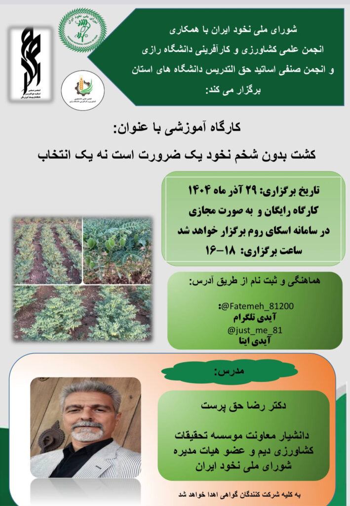 کارگاه تخصصی‌—کشت بدون شخم در نخود: راهبردی ضروری برای کشاورزی پایدار و اقتصادی به استحضار کلیه اساتید، محققان، دانشجویان، کشاورزان پیشرو و فعالان بخش صنعت و تجارت نخود می‌رساند، شورای…
